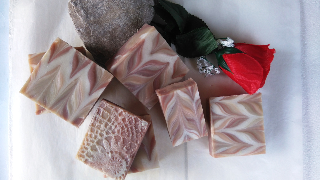 zloženie: olej olivový z výliskov, kokosový, repkový, ricínový, maslo shea, voda z prameňa Podhájska, NAOH, olejový macerát koreňa alkanetu, mica, vôňa ruža, geránium, aloe, litsea